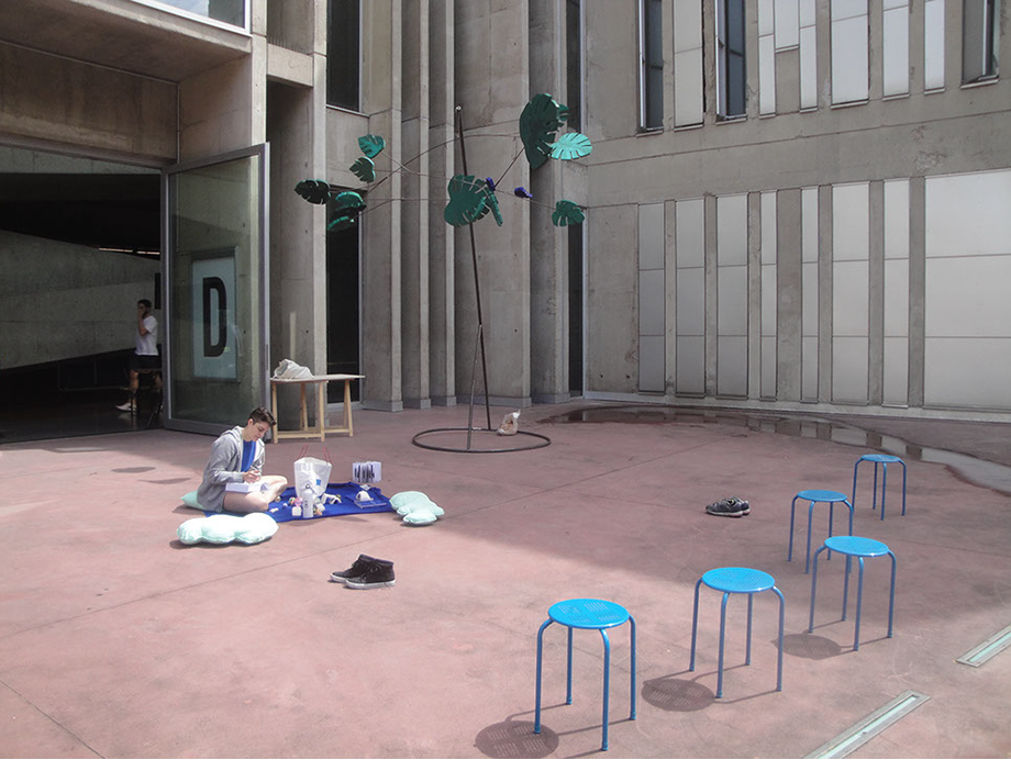 Choisir une balle rebondissante, marcher dans l'espace en la tenant dans sa main. Observer sa texture, son poids, sa résistance. Arrêter la marche. Regarder cette balle: sa couleur, sa taille, ses anfractuosités. Faire pivoter le bras qui porte la balle vers la droite puis vers la gauche, suivre la sphère du regard, continuer le mouvement droite gauche. Continuer en gardant la tête fixe. Puis déplacer la tête dans la direction inverse à celle du bras. Toujours suivre la sphère du regard. Changer de main, puis répéter l'exercice. Emmener le bras dans toutes les directions. Détacher le regard puis se laisser déplacer en suivant le mouvement de l'objet. Reprendre la marche et s'échanger les balles. Quand vous transmettez une balle vous énoncez à haute voie une de ses caractéristique.