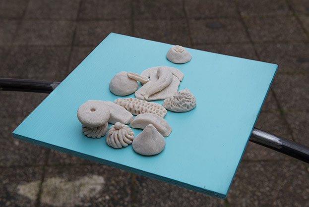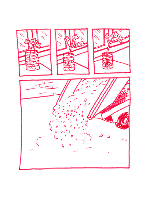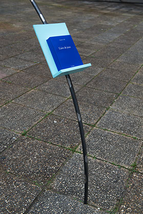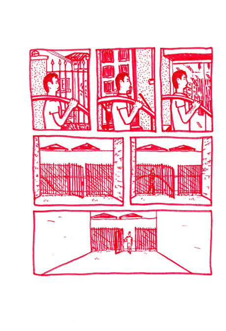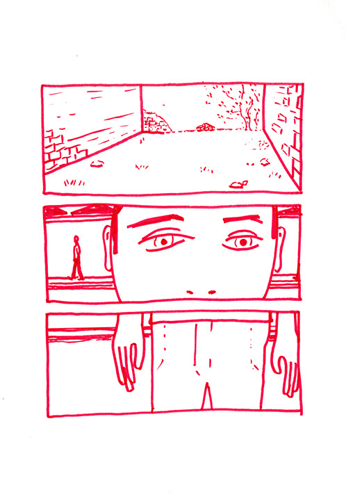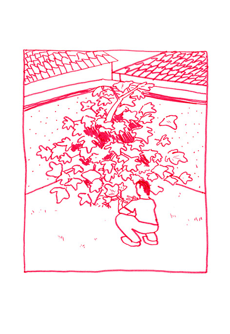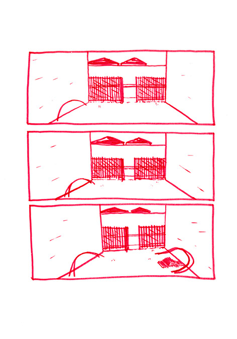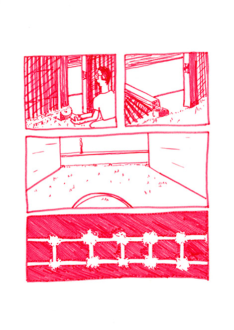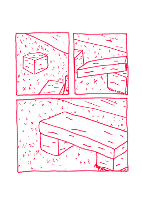 Tous les échelons sont bien soudés, solidement fixés, l’acier se confond. Il joint alors l’échelle courbe et la forme circulaire là où celle-ci est en contact avec le sol. Il déverse dans le terrain vague des copeaux de bois et y place en son centre la forme qu’il a construite. Il décide à présent de construire un banc avec 3 blocs de pierre, deux de taille égale pour faire les pieds et un plus long pour faire l’assise. Il le positionne à droite, proche d’un des deux murs aveugles, aux deux tiers de la profondeur de l’espace. Il plante un figuier au fond dans l’angle droit. Il détruit les grilles ouvrant le terrain sur la rue. Dans l’autre coin, il place un tas de galets qu’il a amassés pendant de multiples années, ces pierres sont des souvenirs de voyages qu’il a ramassés au bord de mer ou dans des torrents.