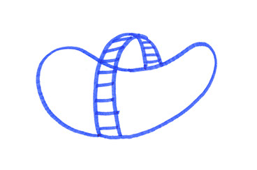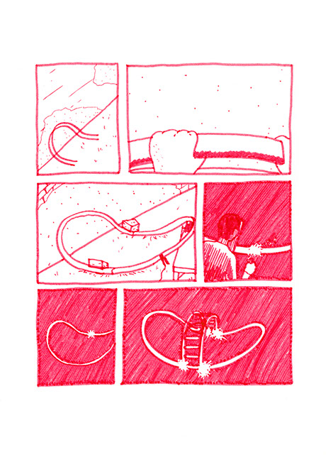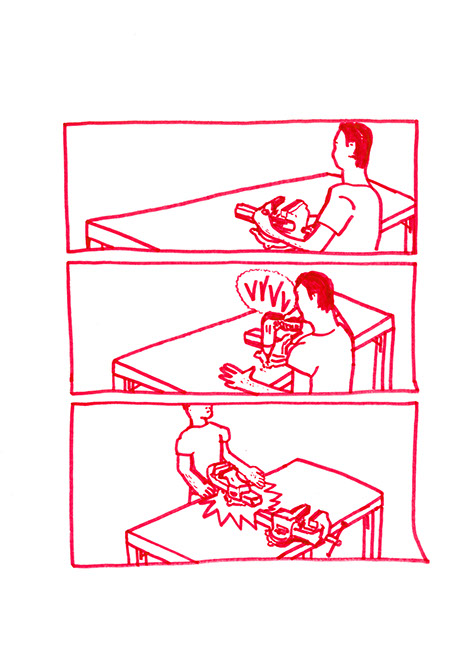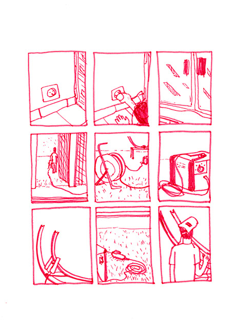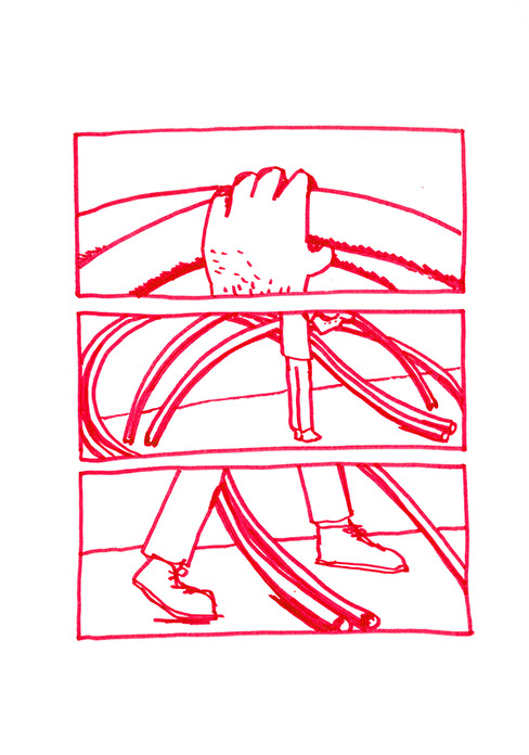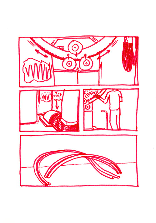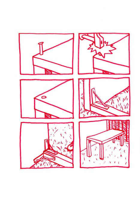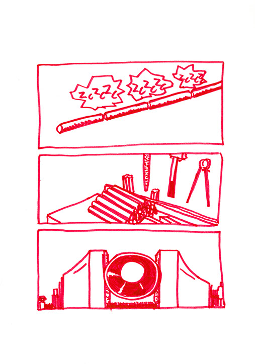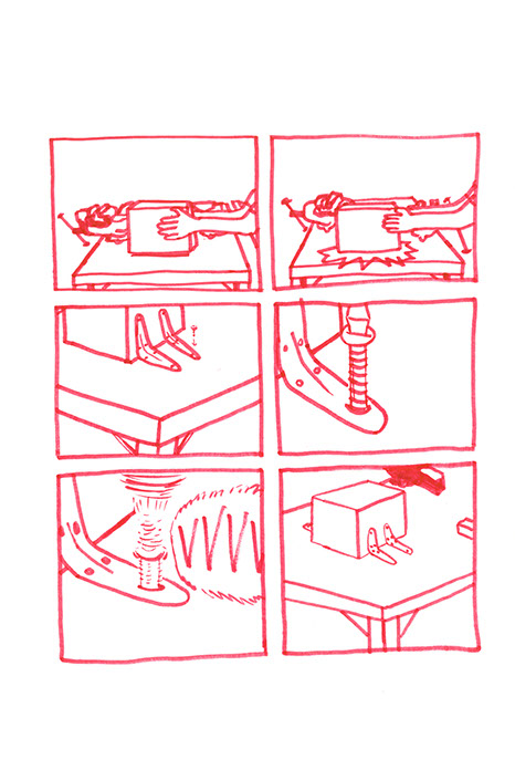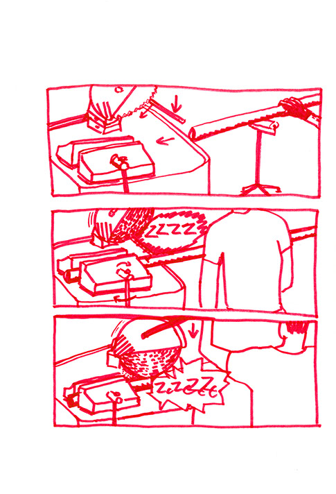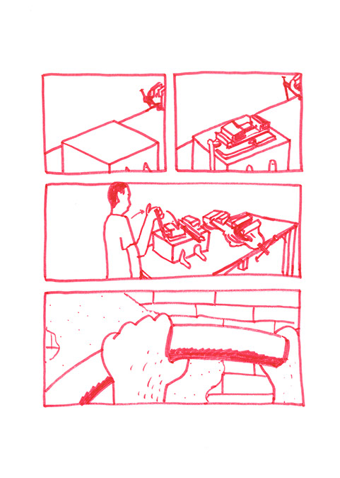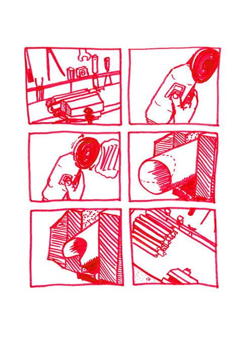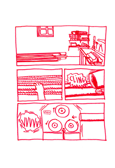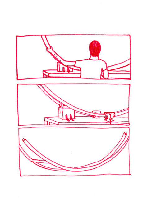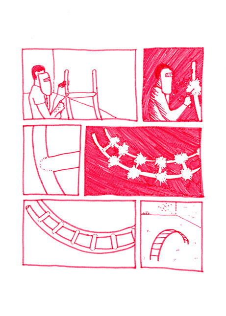 Il se rend chez lui et se met au travail. Il pense à une forme à bascule, une échelle en demi-cercle fixée à un grand cerceau incurvé de part en part. Il prend des tubes en acier pour construire ce jouet de grande taille. Avec une cintreuse, il arrondit de grandes barres pour obtenir deux demi-cercles de taille égale: ce sont les tubes porteurs des échelons. Il agit aussi à l’aide de cette machine, sur deux autres barres plus longues. Il les cintre en leur milieu de manière similaire aux précédentes puis courbe les extré- mités restées droites dans une autre direction.