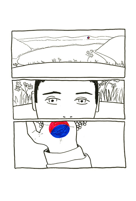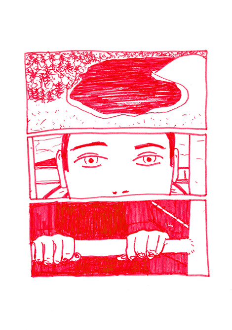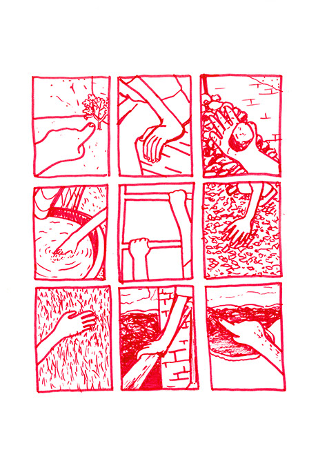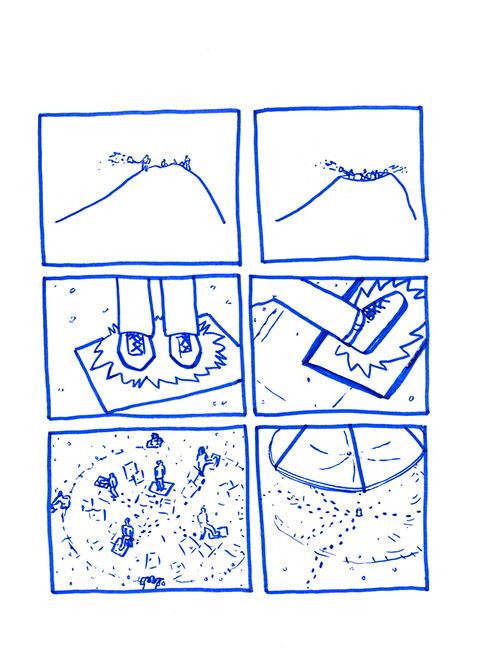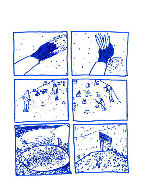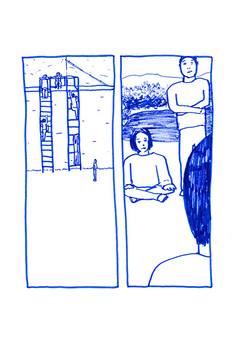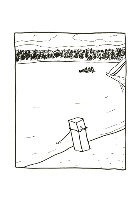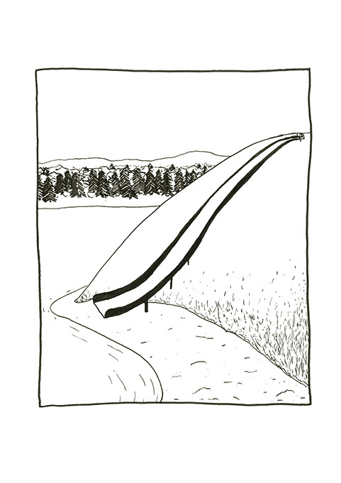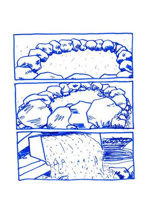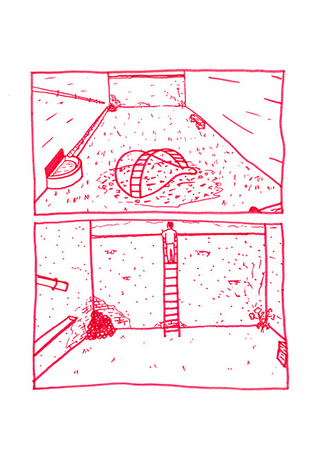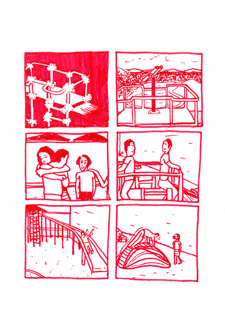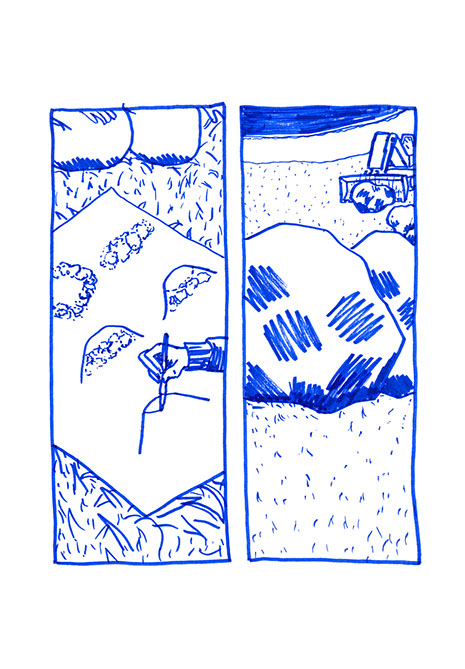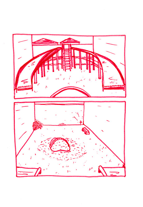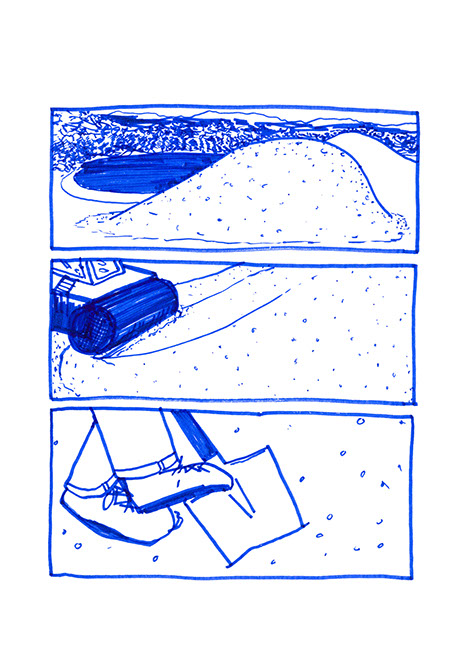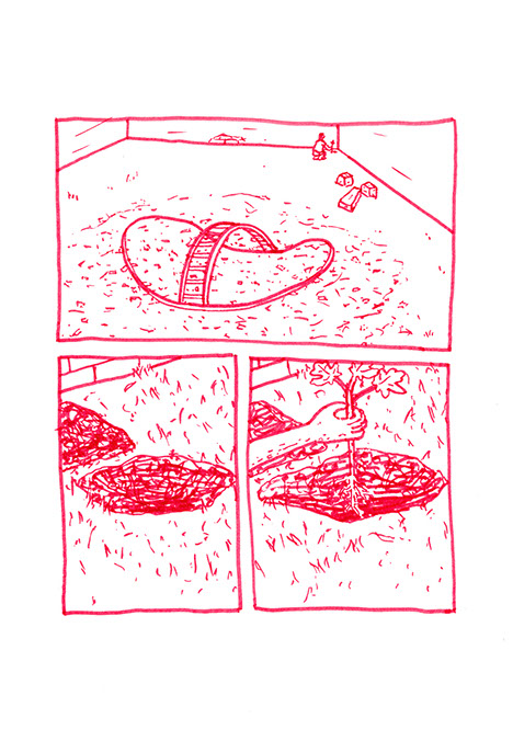 oubliées des aires d’autoroute ou des vieux supermarchés. Il a une histoire à raconter pour chacune de ses balles. Ensuite, il place un demi-toit surélevé au-dessus de la moitié du cratère pour pouvoir s’allonger et regarder le ciel, se protéger des intempéries et voir le paysage, raconter des histoires et être dans un espace maison. Ils jouent à sortir les balles du cratère. Après ils s’amusent à les chercher au pied de la colline ou cachées dans la végétation. Dès qu’ils en trouvent une, ils la lancent en visant l’emplacement d’origine. Ils nomment ce jeu, le volcan. Puis ils décident de construire un immense toboggan qui irait du sommet d’une des deux collines jusqu’en bas vers la plage. Ils le dessinent puis le conçoivent. Ils le testent et s’en réjouissent. Ils remontent et glissent de nouveau. C’est sans fin.