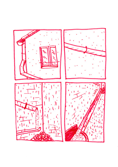 Il place à l’entrée deux larges toboggans courbes. Reliés en leur sommet, ils forment un abri. La plate forme haute s’atteint par deux échelles : une adaptée à la taille des enfants et l’ autre adaptée à la taille des adultes. Elles sont placées de chaque côté: côté rue et côté jardin. Les trajectoires des deux toboggans sont symétriquement opposées. Elles commencent au bord de la rue et sont parallèles à celle-ci. Les deux pentes se terminent proches des deux murs aveugles et parallèles à ceux-ci. Les deux slideurs sont dos à dos. Ils s’élancent et arrivent plus loin dans l’espace jeux. Robert Gros-Doigts installe une vasque en pierre, à gauche contre un des deux murs aveugles, à la moitié de la profondeur du terrain. Puis il détourne une gouttière pour que l’eau de pluie vienne la remplir et même parfois la faire déborder.