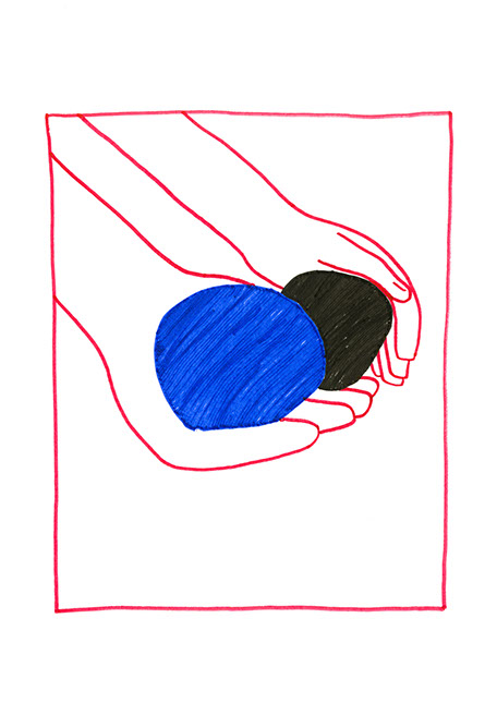 Au milieu de l’étendue d’herbe, ils forment un large cercle avec de grandes roches, d’autres de taille moyenne et des gravats. Ils recouvrent ce monticule circulaire par un grand tas de terre. Ils le tassent puis creusent son sommet. Ils tassent aussi le creux. Ils placent en son centre une chape de béton qui vient se lover dans la cavité. Elle est percée en son fond. Le trou est relié à un tuyau qui passe sous le monticule pour évacuer l’eau de pluie. Les pentes du volcan sont douces sur l’un de ses flancs et abruptes sur l’autre. Le dénivelé change progressivement autour de la forme. Il est facile de gravir l’inclinaison à l’intérieur du trou concave. Ils sèment de l’herbe dense et des plantes à racine profonde pour solidifier les sols. Ils attendent le temps qu’il faut. Une fois la colline creuse verdie, Robert Gros-Doigts y place en son centre sa collection de balles rebondissantes. Il l’a constituée au l des années, ce sont des cadeaux, des trouvailles, des achats ou des larcins dans des magasins de merveilles, des échanges avec les machines