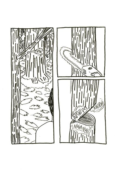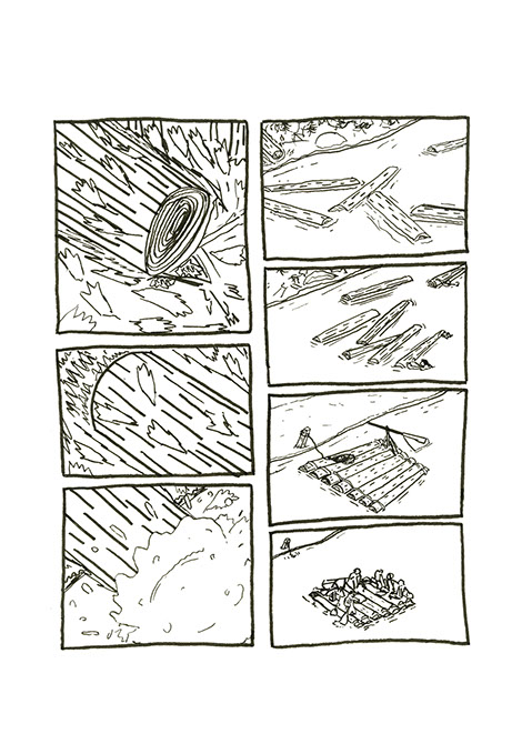 Robert Gros-Doigts propose la construction d’un radeau fait de troncs reliés entre eux par des liens. Ils choisissent certains arbres à différents endroits de la forêt pour répartir et diluer le déboisement. Un petit peu de lumière pour les nouveaux arrivants, ça ne peut pas faire de mal. La forêt s’étend sur une forte pente. Une fois coupés, les troncs glissent jusqu’au lac. Ils rassemblent les troncs, les as- semblent avec des cordages, se confectionnent des pagaies puis voguent jusqu’à l’autre rive. Ils tendent une corde entre les deux berges pour que d’autres puissent traverser si les pagaies venaient à disparaître.